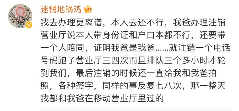该网友这段视频,在微博上引来众多网友共鸣。由于三大运营商在全国各地采取了不同的优惠力度,有不少人手上有着几张电话卡,而归属地却来自五湖四海,这些电话卡如何销号,涉及面极广。而网友们晒出的“关于注销电话卡的那些事”,也是五花八门。有人表示去营业厅销户也很麻烦,甚至必须证明“我爸是我爸”;有人表示异地注销业务特别难办,甚至需要去手机号的归属地办理,所以校园卡到现在还在欠费中;还有人建议快速销号的办法是欠费停机三个月,会自动销号……