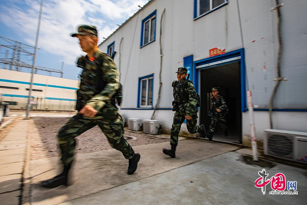 而这样的警惕和应急反应能力并是不一朝一夕能够练就的,为全面保证官兵的应急反应能力,中队经常在厂区组织应急处突演练。这是在日常演练中,备勤点待命的中队官兵接到有人潜入厂区伺机进行“破坏”的报警后,随即启动紧急预案,派出应急小组迅速赶到现场,将“强行闯入者”制服在警戒区域处突的一个场景。中国网记者 郑亮摄