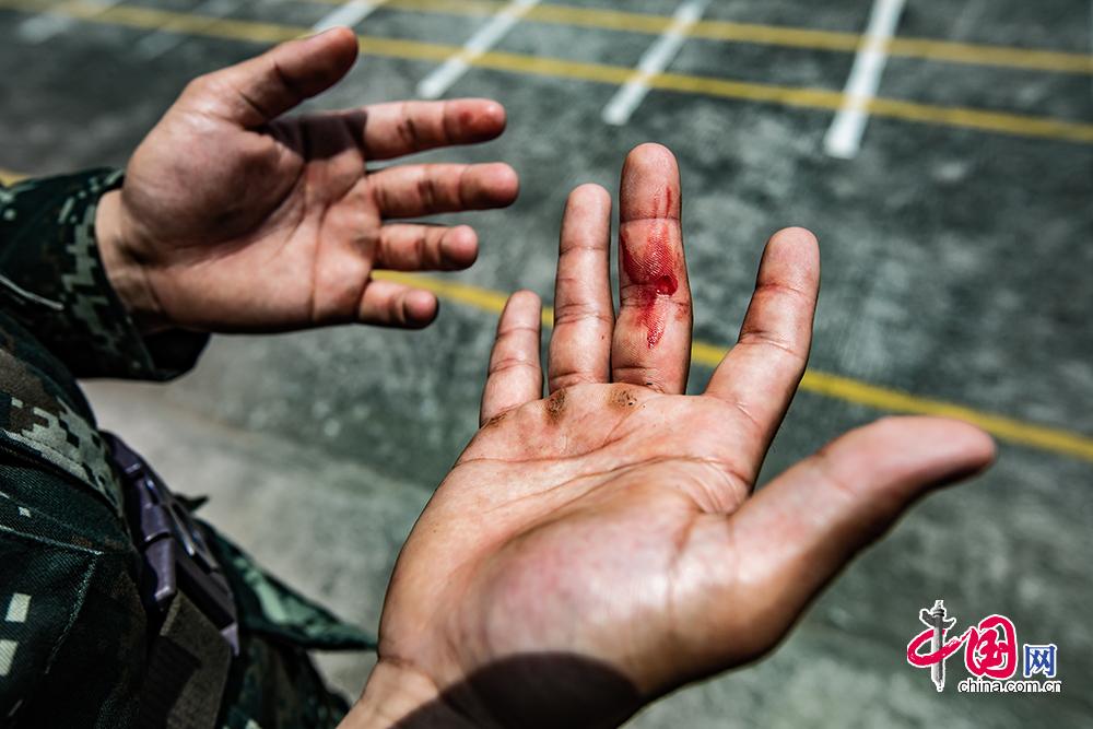 中队的官兵把每次训练都当做实战认真对待,一双双布满老茧的双手和训练中流的血汗,正是每一个中队战士努力的最好证明。中国网记者 郑亮摄