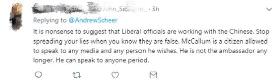 “自由党官员和中国人合作的说法就没道理。别再扩散你那明知是假的的谎言了。麦家廉是一个公民,他可以对任何媒体或任何人说任何他想说的话。他不再是个大使了。他可以和任何人说话,就这样。”