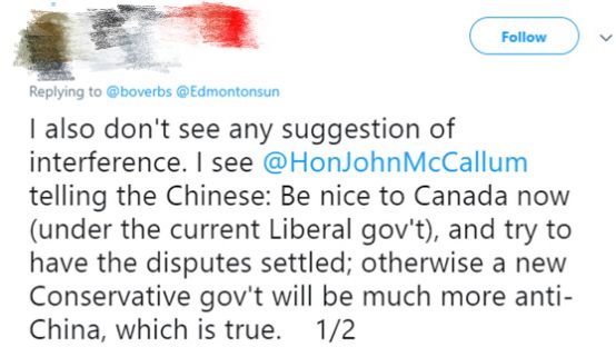 “我根本没看到任何干预(大选)的意思。我只看到麦家廉告诉中国人说:对现在(自由党政府下)的加拿大好点,努力解决争端;否则一个新的保守党政府将会更反华,而这是真的。”
