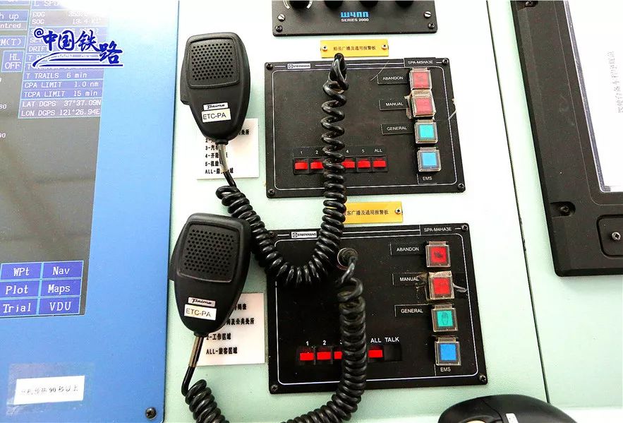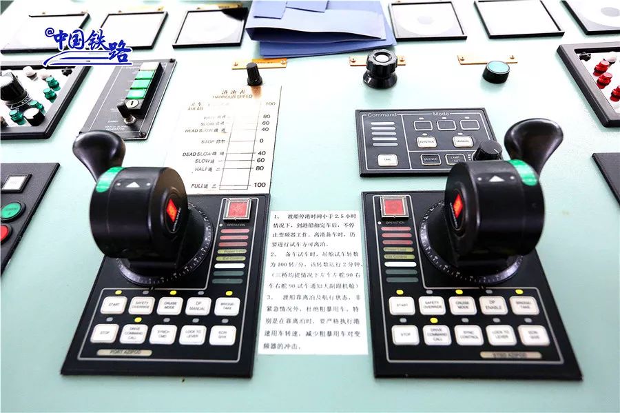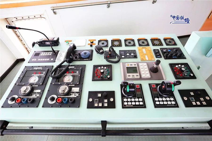 有好奇小伙伴提出疑问,开船为什么不用舵盘呢?原来这叫做“单手柄”,用于操纵渡船的前进方向——向前、向后、向左、向右,还可以360度旋转,这也是“中铁渤海号”渡船与普通客滚船的区别。一般来说,利用柴油机推进系统的船舶使用“舵盘”控制方向。