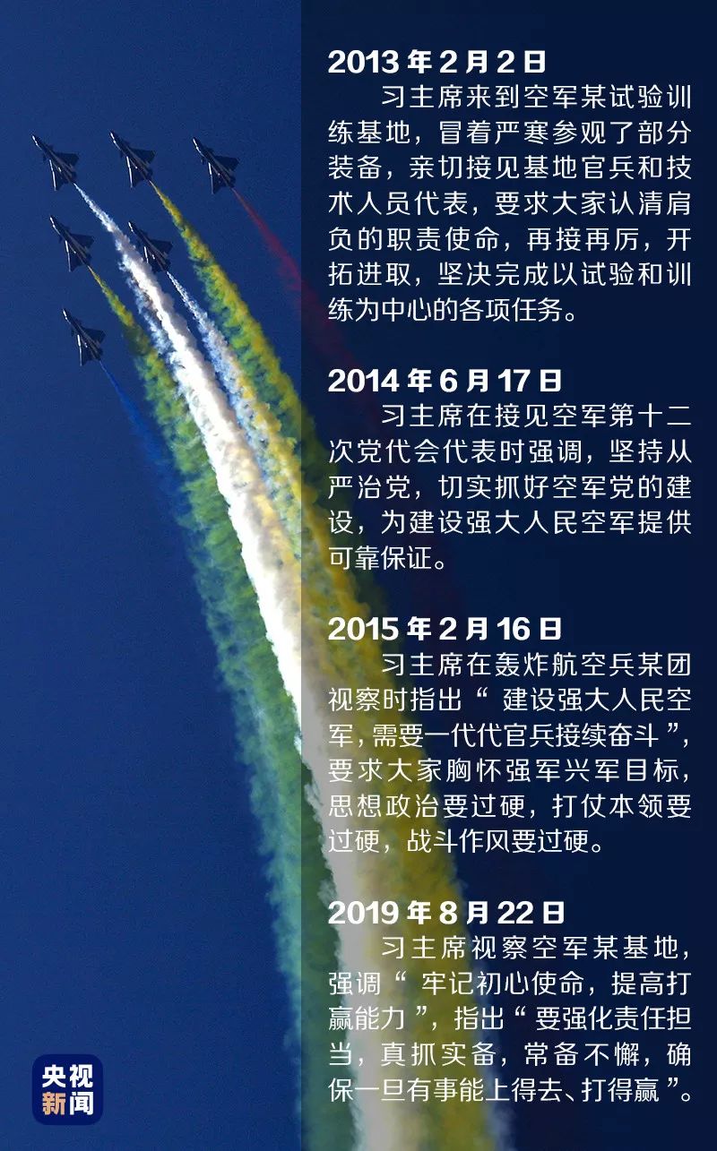 走过峥嵘岁月,奋进伟大时代,开辟光明未来,人民空军的昨天、今天和明天,始终把忠诚和使命镌刻在祖国的蓝天,书写辉煌篇章。站在新的历史起点上,让我们重温习近平主席关心人民空军建设发展的谆谆教诲,开启历史性跨越的新航程。
