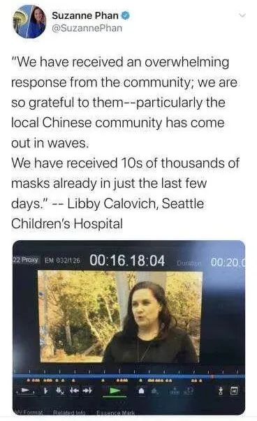 华盛顿州西雅图是美国疫情发现最早、疫情比较严重的地区之一。当地记者苏珊娜潘在社交媒体上分享了西雅图儿童医院莉比 卡洛维赫的感言:“我们得到了社区巨大支持,非常感谢大家,特别是踊跃站出来的华裔群体。短短几天内,我们就收到数以万计的口罩。”