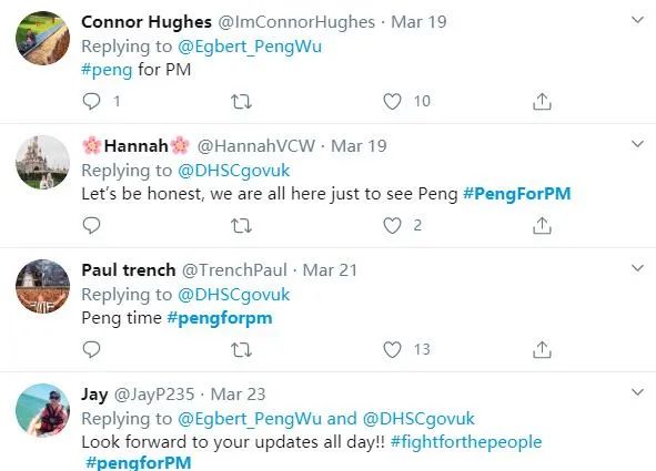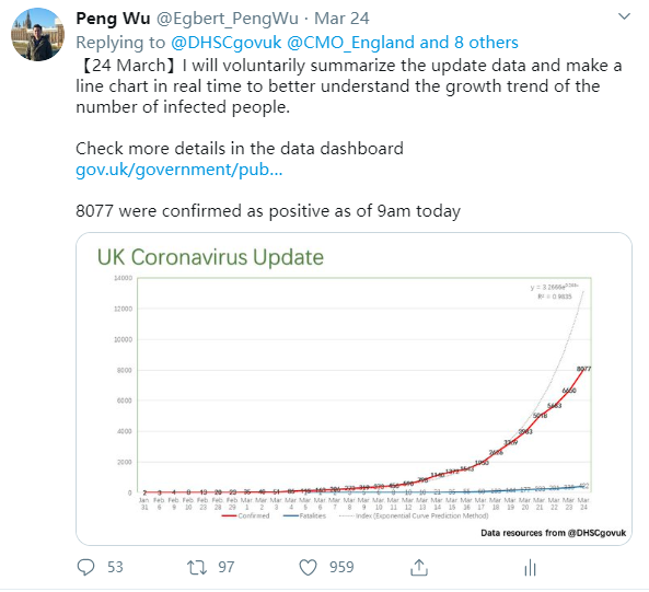 没想到,他第一次将制好的图表发布在英国卫生部推特账户下,就收获了当日最高关注和点赞量。