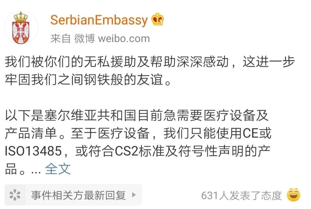 3月21日,塞尔维亚驻华大使馆官博发文向中国求助,并且提供了目前塞尔维亚急需的医疗设备及产品清单。