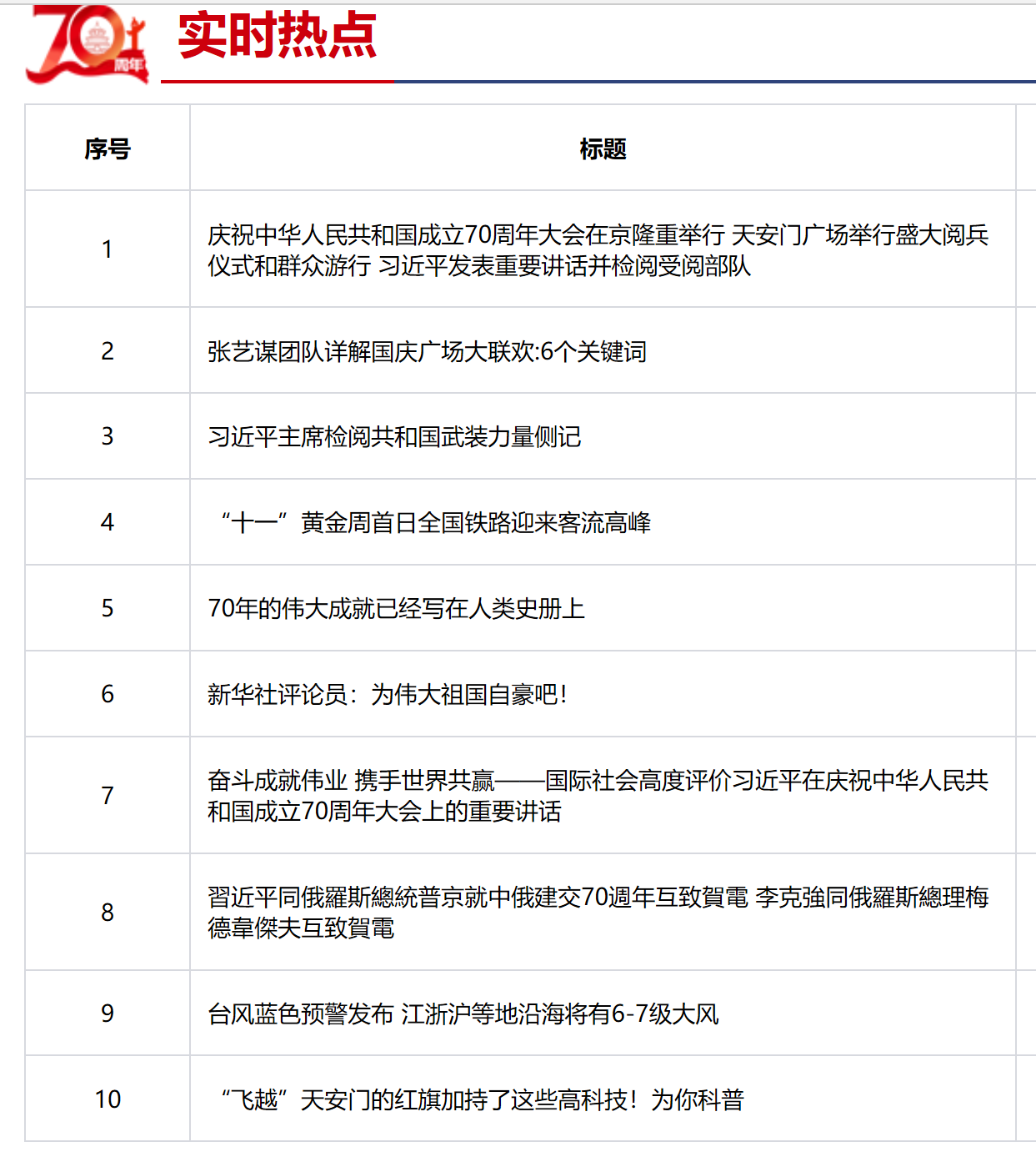 今天媒体最大的报道热点全部聚焦在昨天国庆阅兵和群众游行上,大数据显示,新华社首发的《庆祝中华人民共和国成立70周年大会在京隆重举行 天安门广场举行盛大阅兵仪式和群众游行 习近平发表重要讲话并检阅受阅部队》转发最高,其他的比如《张艺谋团队详解国庆广场大联欢:6个关键词》《“飞越”天安门的红旗加持了这些高科技!为你科普》也上榜实时热点top10。