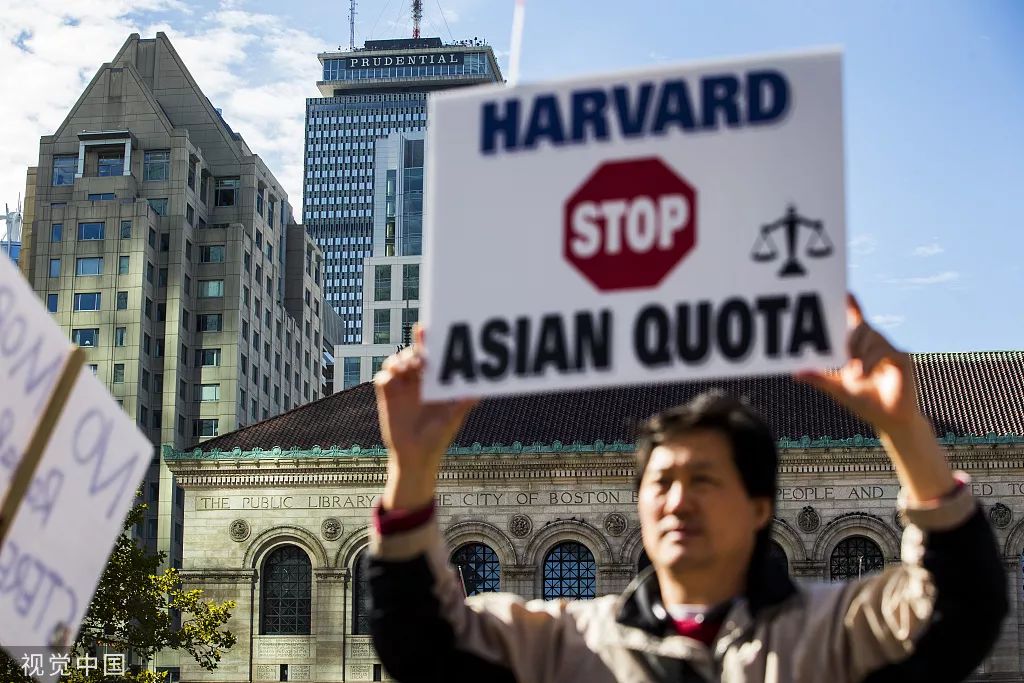 资料图:2018年10月14日,美国波士顿,反对哈佛大学录取政策的示威者举行抗议活动 图自视觉中国