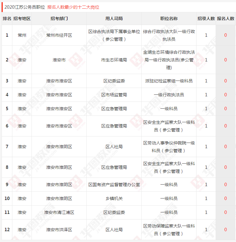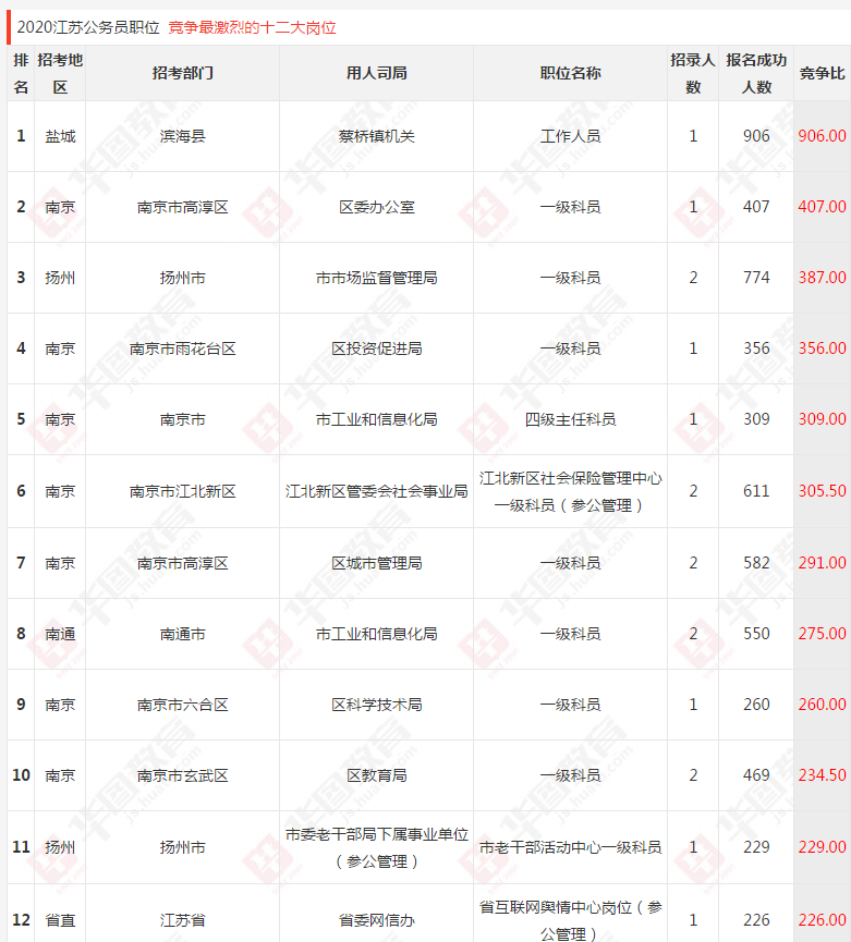报名人数最多的岗位是盐城市滨海县蔡桥镇机关,报名人数达906人,原因是不限专业且学历要求较低,为“大专及以上”。其次是南京市高淳区区委办公室一级科员岗位,407人争一岗。