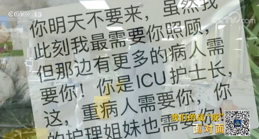他告诉蔡利萍:“你明天不要来,虽然此刻我最需要你照顾,但那边有更多的病人需要你,你是ICU护士长,重病人需要你,你的护理姐妹也需要你!注意休息,注意防护!你要给我好好的!”