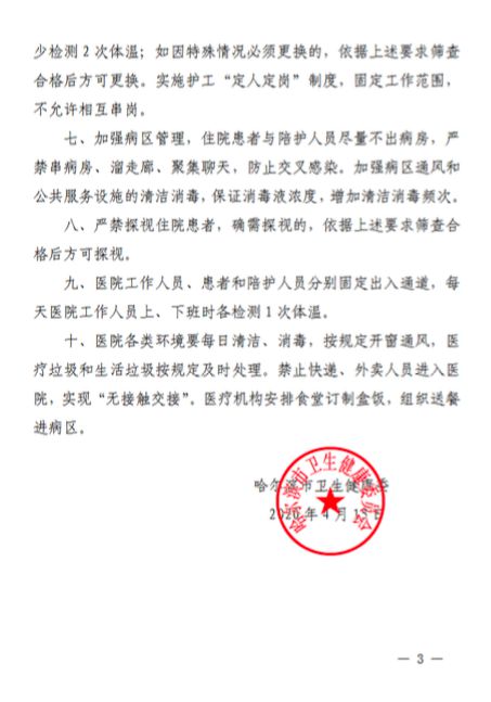 此外,哈尔滨市卫健委要求医院加强病区管理。实行门禁制度,24小时封闭管理。严禁病区内扎堆聊天、随意走动。针对患者出去缴费、做辅助检查等存在的风险,医院需采取错时段开展辅助检查、及时清场、严格消毒等措施。