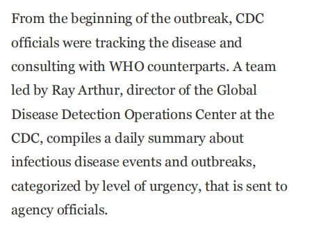 从疫情暴发开始,美国疾病预防控制中心官员一直在进行追踪并与世卫组织对应人员进行商讨。由疾控中心全球疾病检测运营中心主任雷·亚瑟(Ray Arthur)领导的团队每天也会对有关疫情的信息进行汇总,并按紧急程度进行分类,然后发送给机构的更多官员。