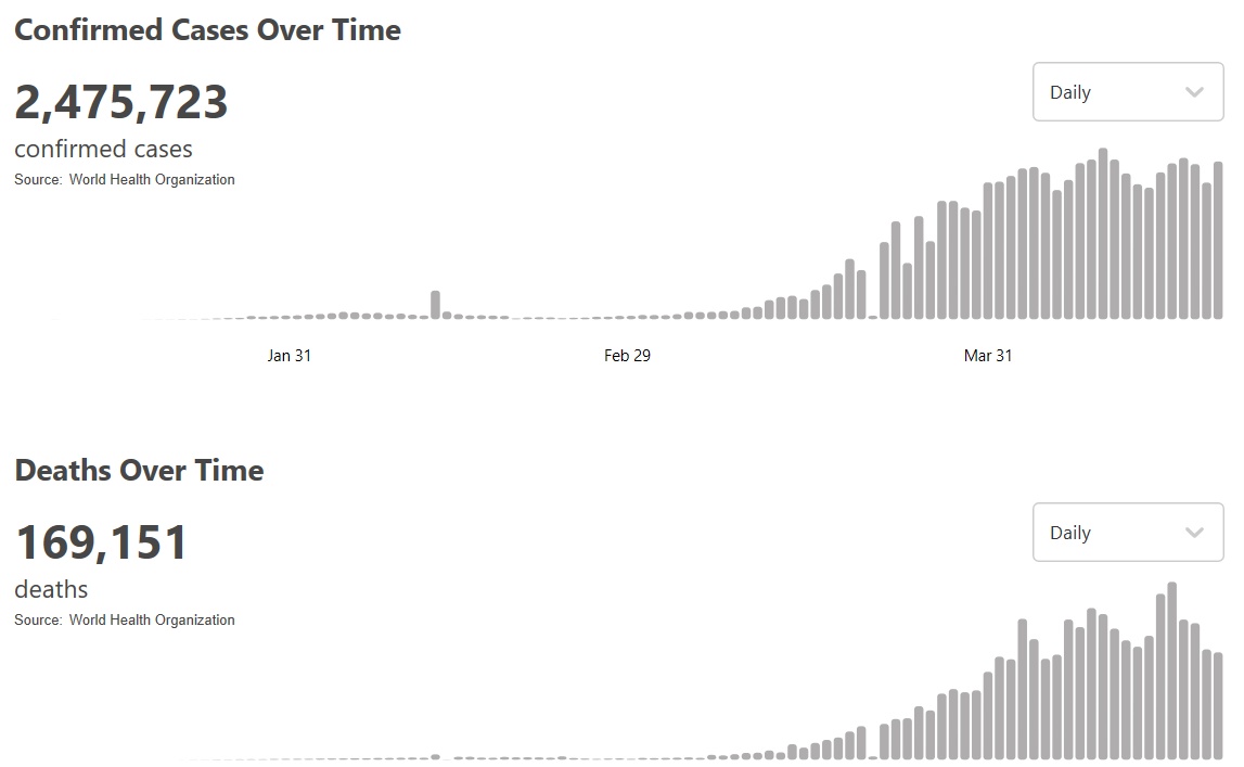 央视新闻消息,根据世卫组织最新实时统计数据,目前全球确诊新冠肺炎2475723例,死亡169151例,中国以外超过239万例。