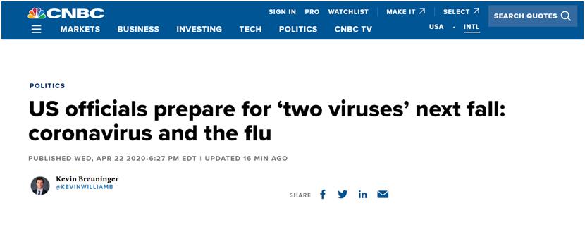 环球网报道,下一个秋冬流感季节,新冠疫情将卷土重来?美国消费者新闻与商业频道(CNBC)22日报道称,美国官员正准备与两种病毒未来可能同时在美传播作准备,在当天白宫疫情简报会上,美国总统特朗普和疾控中心(CDC)主任罗伯特•雷德菲尔德也分别就流感和新冠疫情下一秋冬季可能同时暴发作出表态。