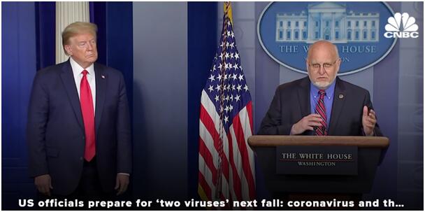 特朗普讲完话后,雷德菲尔德在会上继续就有关问题进行表态。他表示,就在今年此次流感季节即将结束之际,美国暴发了新冠病毒。而当下一个流感季节来临时,他们将无法利用美国流感监测系统来追踪新冠疫情的暴发。