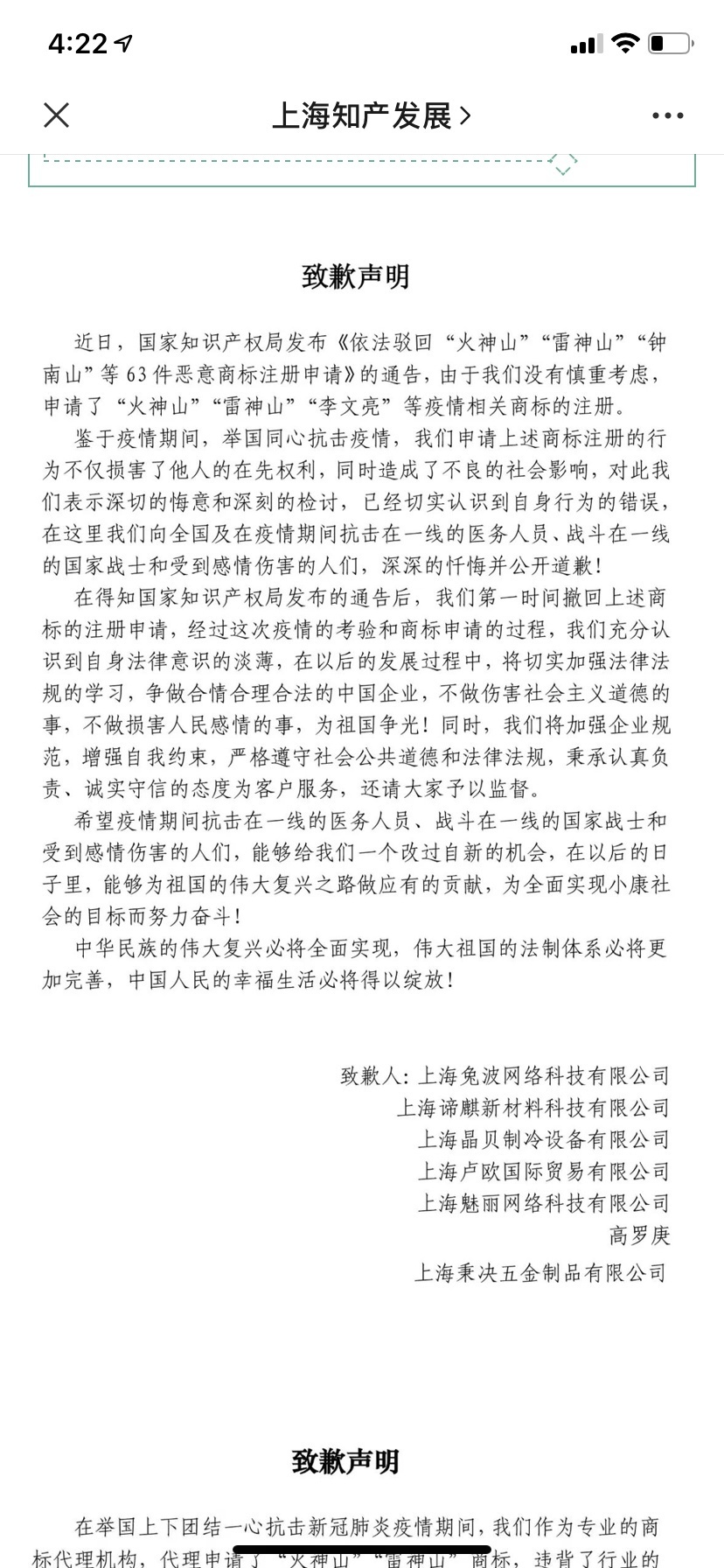 在案件查办过程中,上海市市场监管局执法总队坚持行政处罚与教育引导相结合,对涉案企业加强法制教育。涉案企业均表示已充分认识到恶意抢注涉疫商标行为的违法性及社会危害性,并主动公开致歉,签署了《规范经营承诺书》,承诺诚实守信,依法规范经营。