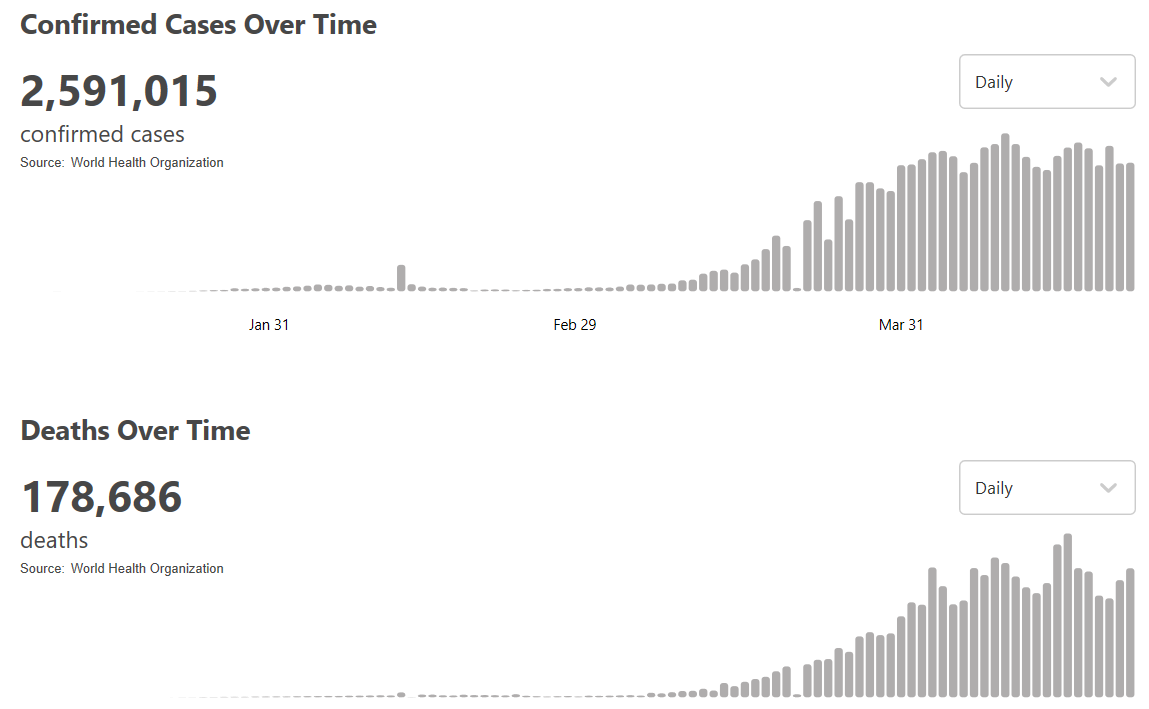 据央视新闻客户端报道,根据世卫组织最新实时统计数据,目前全球确诊新冠肺炎病例2591015例,死亡178686例,中国以外病例超过250万例。(总台记者 朱赫)