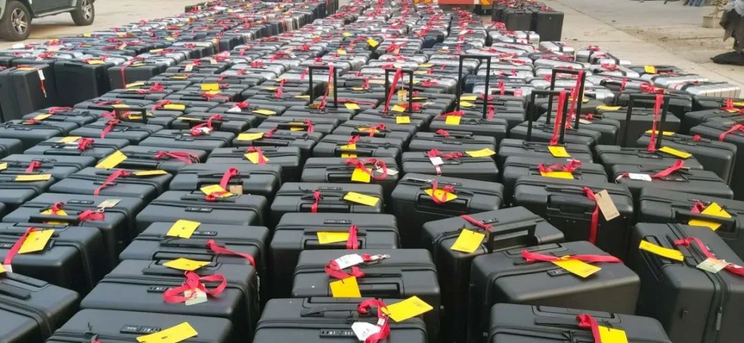 每人一个行李箱,箱子上有定制的姓名标志牌。