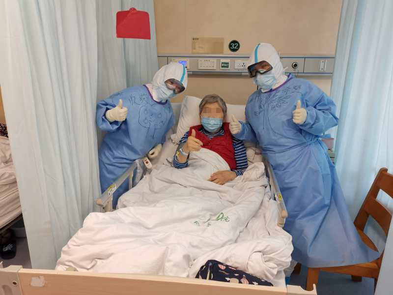 21床的阿姨收治入院的时候很病情危重,经过无创通气,高流量氧疗,目前已是改导管吸氧了,也逐步过渡到了下床活动,阿姨听到我们的祝福,除了握拳给自己加油鼓劲,更在我拉着她手的时候跟我比起了手劲,感觉力气比我还大。听到我的夸奖,阿姨眉毛弯弯似新月,明显感受着她的喜悦与激动。32床的阿婆前两天突发脑梗左侧肢体乏力,当时做完CT回来她十分紧张,一再追问是不是不会好了,经过在床边大半个小时的开导,阿姨长长地松了囗气,说:“闺女,我们是一家,你的话我信,多亏在医院发病,有你们在我有信心!”今天,看到我们的祝福,她逐字读完,高高翘起右手的大拇指说无锡医疗队最棒!其他病房的阿姨们也热情和我们合影,大家都在播种希望中期待着开花结果!